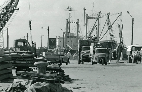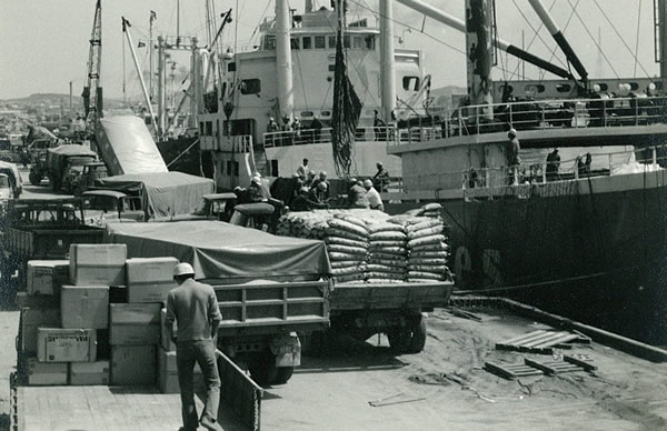 昭和25年1月3日、米軍指揮下の「那覇港湾荷役作業隊」を株式会社國場組が引き受け、昭和27年10月24日、株式会社國場組の系列会社として当社の前身である沖縄通運株式会社がスタートしました。当時の琉球政府より一般港湾運送事業に基づく第一種業者の免許を受け、創業以来、沖縄の物流の中心である那覇港とともに歩んでまいりました。その間、沖縄と本土を一貫して結ぶ内航システム輸送、国際海上輸送、船舶代理店、建設・重量品輸送、港湾荷役を中心に、物流システムを築いてきました。